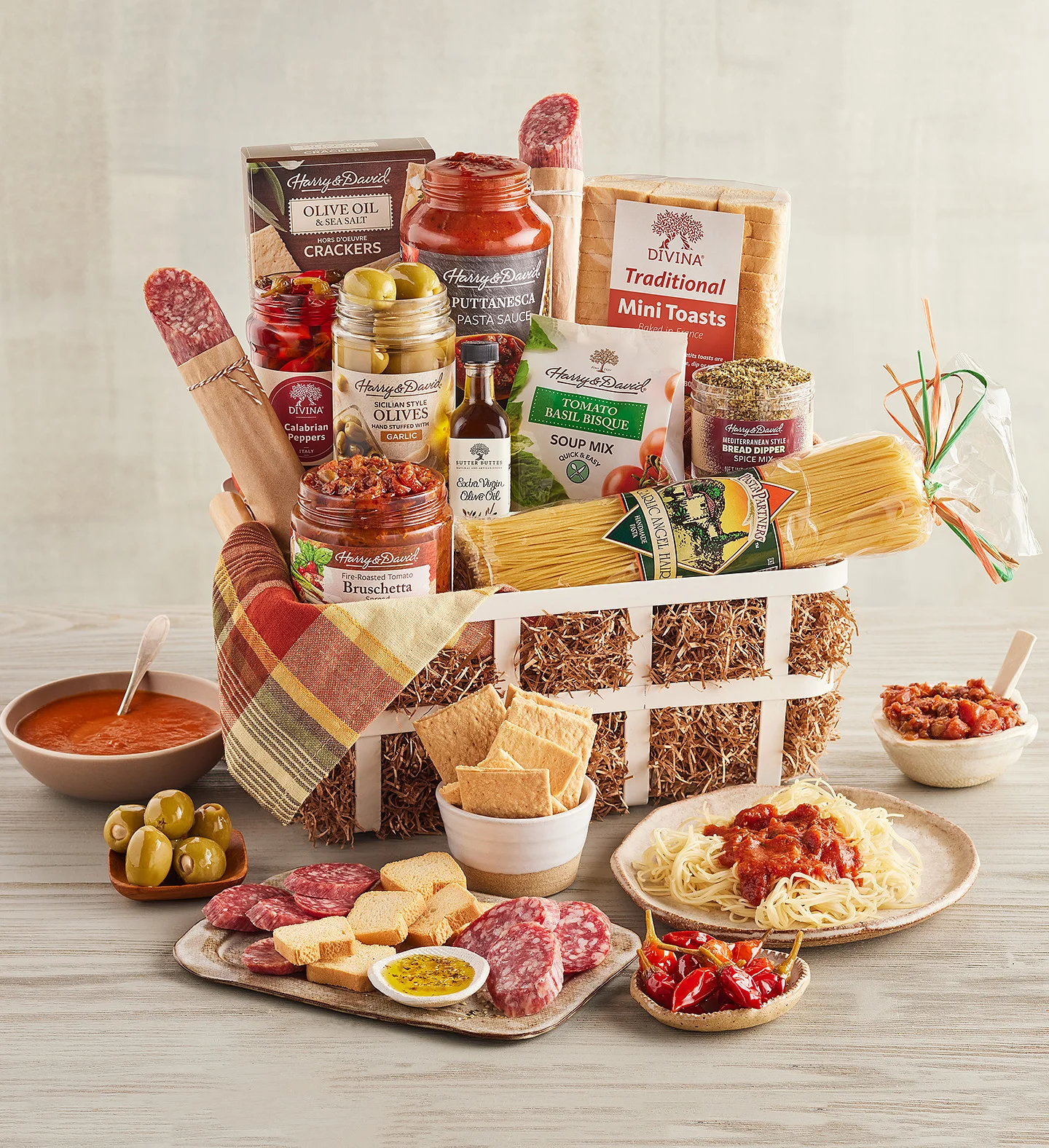 How would you like to eat like an Italian without having to book a flight to Rome? Inside this basket are ingredients to put together a sumptuousItalian meal, such as a delicious pasta puttanesca. Get yourmangiastarted with bruschetta, olives, and salami.